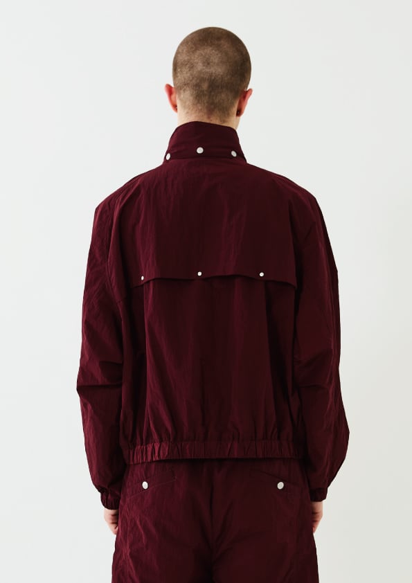 ナイロンのリップストップ素材を採用したフライトジャケットデザイン。スタンドカラーと立体的なジップポケットが特徴。衿には共地のフードをドットボタンで収納することで、機能性とボリューム感をプラスしています。袖口、裾には平ゴムを通して、シャーリングデザインにすることで、オーバーサイズかつ、丸みのあるパターン設計にしています。