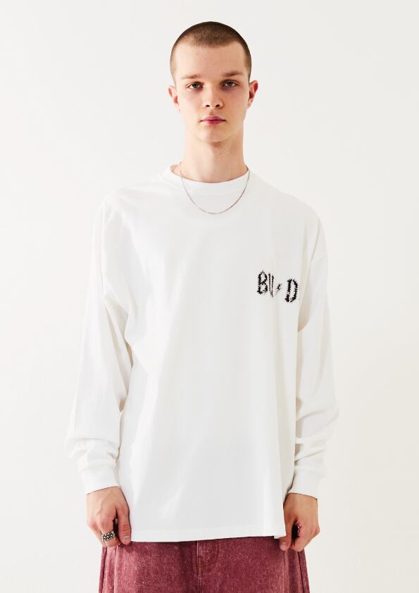BUDS(つぼみ)をモチーフとしたグラフィック長袖T-SH。左胸のモチーフにはメタルのラインストーンを重ねてプリントすることで、さりげなく、ハードな印象を与えています。歪みを持たせたバックプリントのデザインは幻影をイメージし、サイケデリックさを表現しています。ボディーはオーバーサイズシルエットに設計。リラックスムードでご着用いただけます。