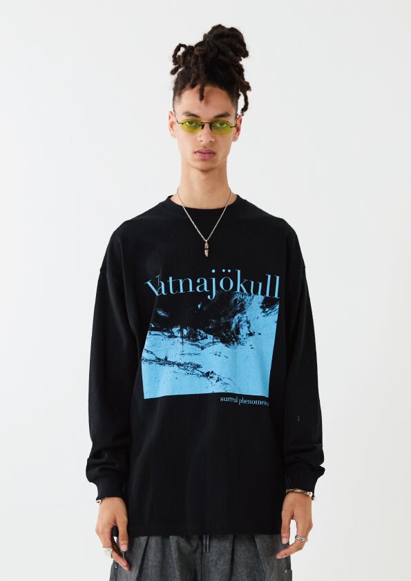 アイスランドの氷の洞窟をコラージュさせて作成したグラフィック長袖T-SH。モダンなフォントとアイスケーブを色の陰影で表現しています。ボディーはオーバーサイズシルエットに設計。リラックスムードでご着用いただけます。