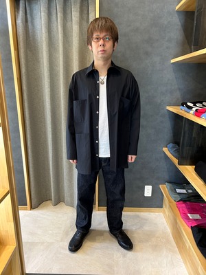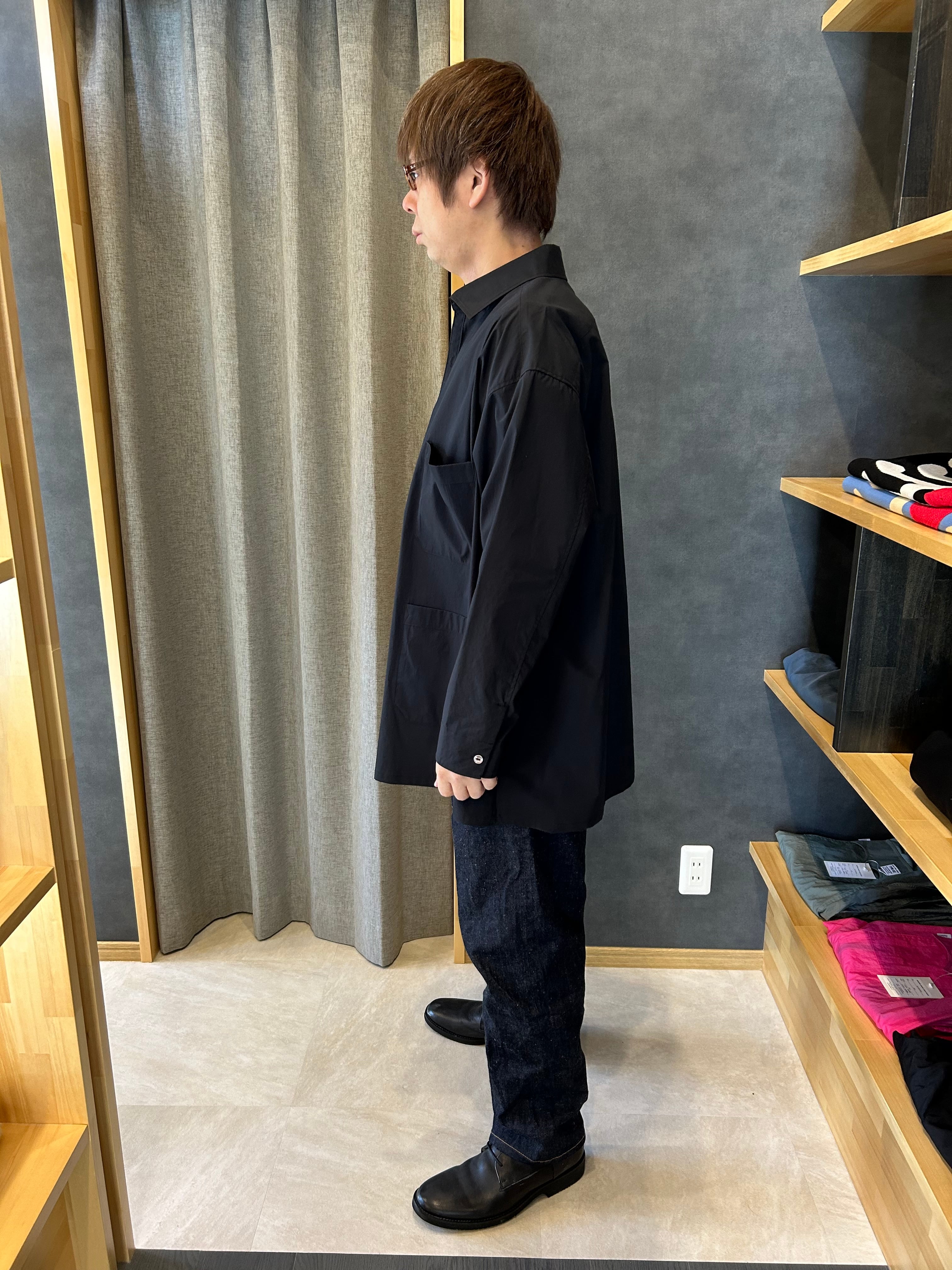 ドレスシャツのパターンから展開した上品な雰囲気のカバーオール。シルエットは大きめでボックスシルエットになります。