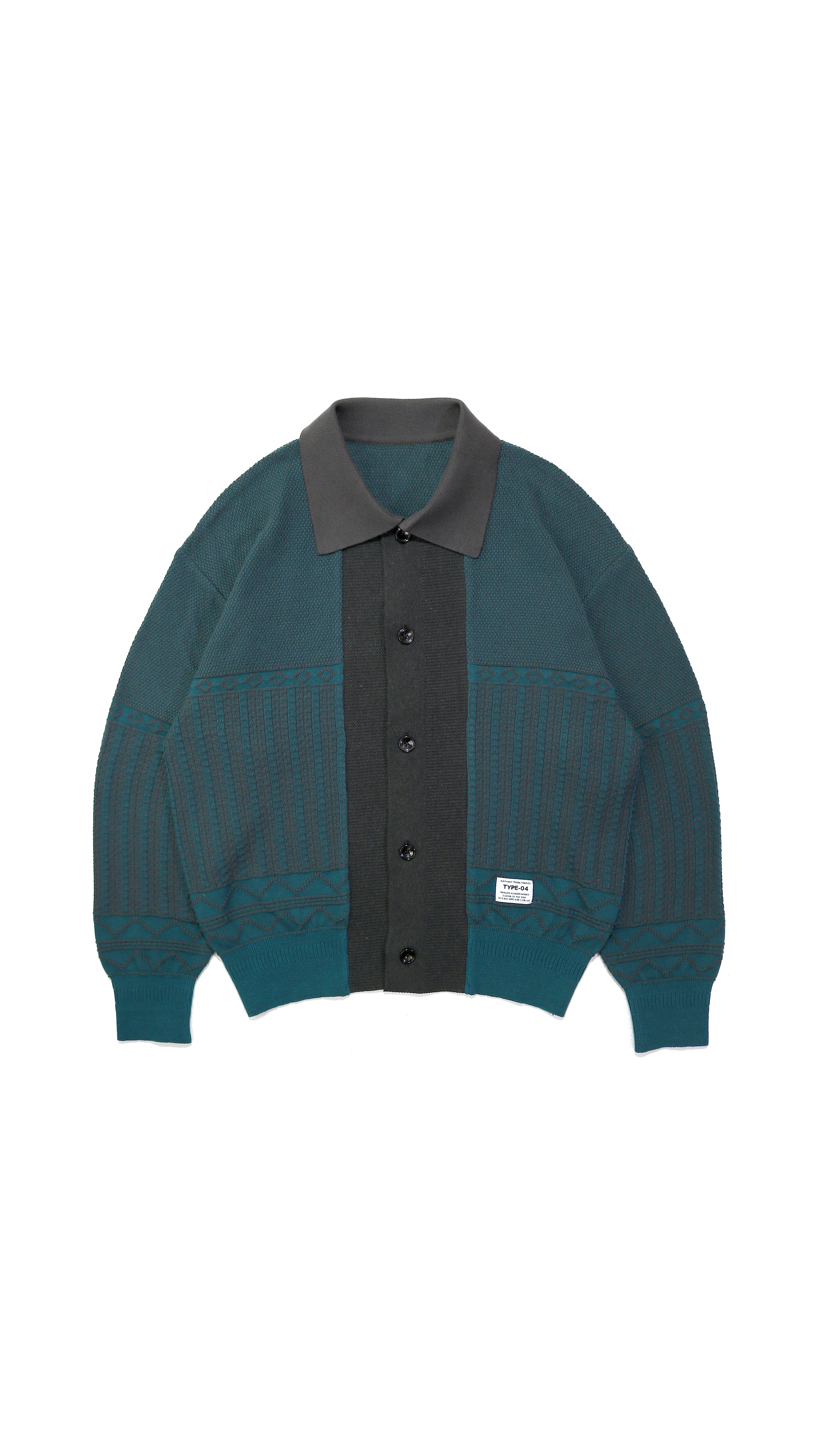 プレーキング編みやジャガード編みなど、細かく複雑な編地を複数使用した9ゲージのニットシャツ。
